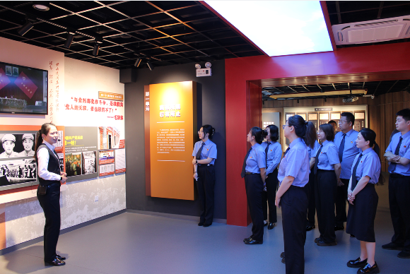 在参观即将结束时,院党支部书记曹红亮带领参与学习的干警在党旗前庄严宣誓,重温入党誓词。