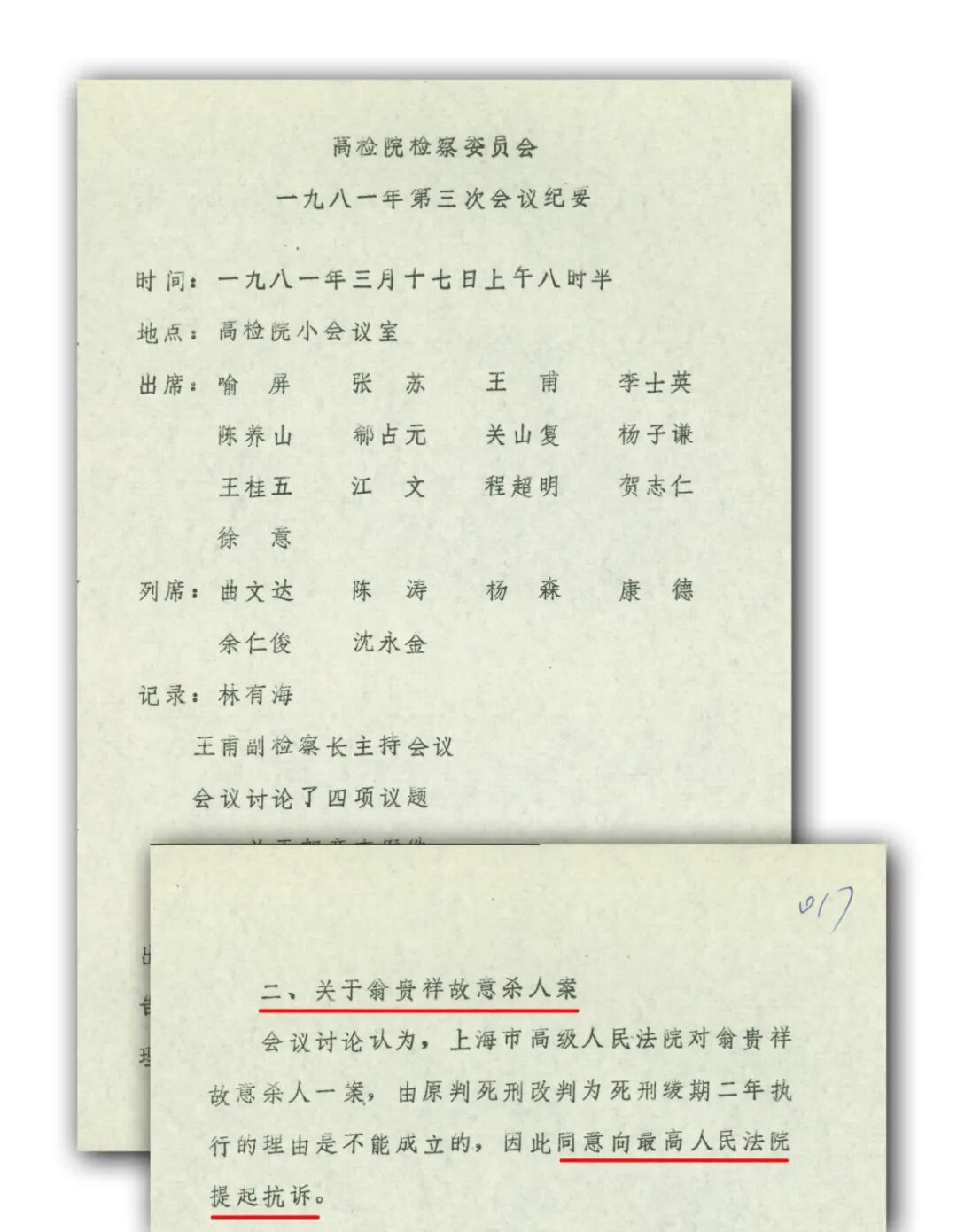 1981年3月17日最高人民检察院检察委员会第三次会议上,检委会成员们专门讨论了翁贵祥杀人案这一议题。