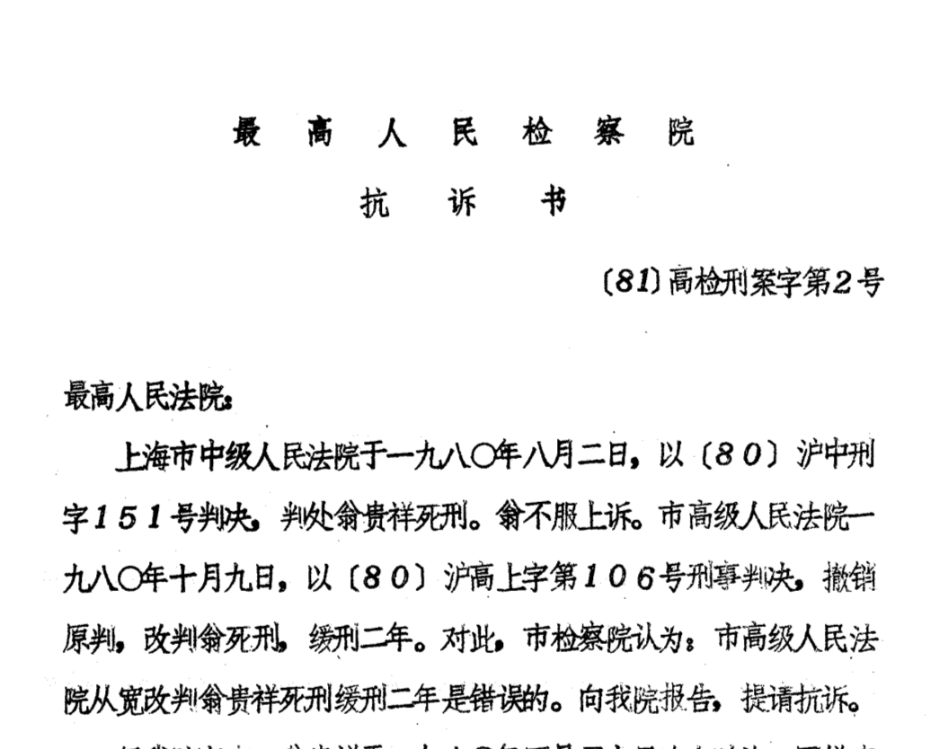 1981年3月17日,最高人民检察院检察委员会第三次会议上,检委会成员们专门讨论了翁贵祥杀人案这一议题。会议讨论认为,上海市高级法院对翁贵祥故意杀人一案,由原判死刑改判为死刑缓期二年执行的理由是不能成立的。经审查,最高人民检察院于1981年3月26日向最高人民法院提出抗诉,最高人民法院采纳抗诉意见,于同年5月16日改判被告人翁贵祥死刑。这是检察机关恢复重建后,由最高人民检察院提出抗诉的第一起案件。这起案件的办理体现了检察机关在维护司法公正方面的重要作用,也为后续检察机关依法履行抗诉职能提供了实践范例。